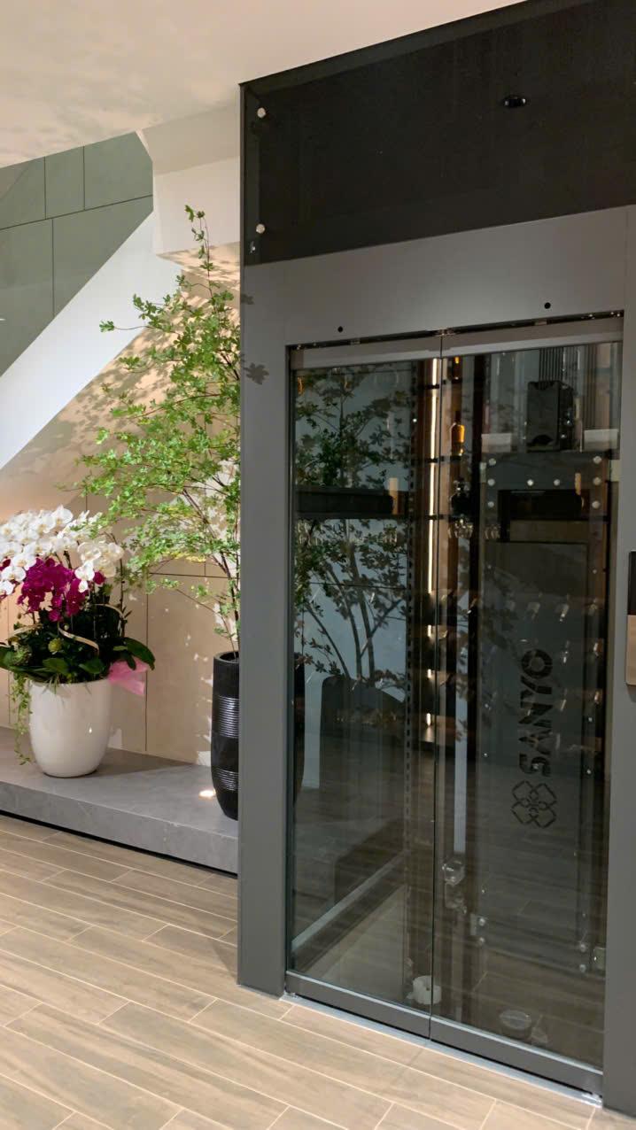 Thang máy gia đình Sanyo dễ dàng lắp đặt nhờ thiết kế siêu tiết kiệm diện tích, không hố pít, không phòng máy, giếng thang 4 mặt kính tích hợp.